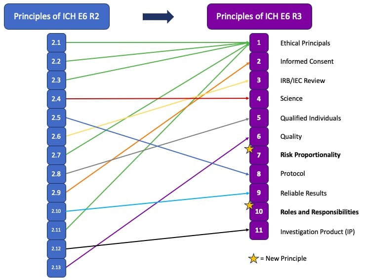 The release of ICH E6 R3, the most recent update to the Guideline for Good Clinical Practice, has introduced some significant changes from what was seen in the prior versions. The key changes are centered around the reorganization of the principles as a whole with the total number of principles changing from 13 to 11. This change was achieved through the consolidation of five of the key principles from R2 into the first principle of R3, and two new principles, 7 and 10, being introduced. The key content changes from prior versions of E6 include: (1) clarifying the role risk should play in study design; (2) more clearly defining roles and responsibilities in a study; (3) incorporating quality principles in study design; (4) making protocols more clear and concise; and (5) improved data generation, study transparency and IP Management. More details on these changes has been outlined below.